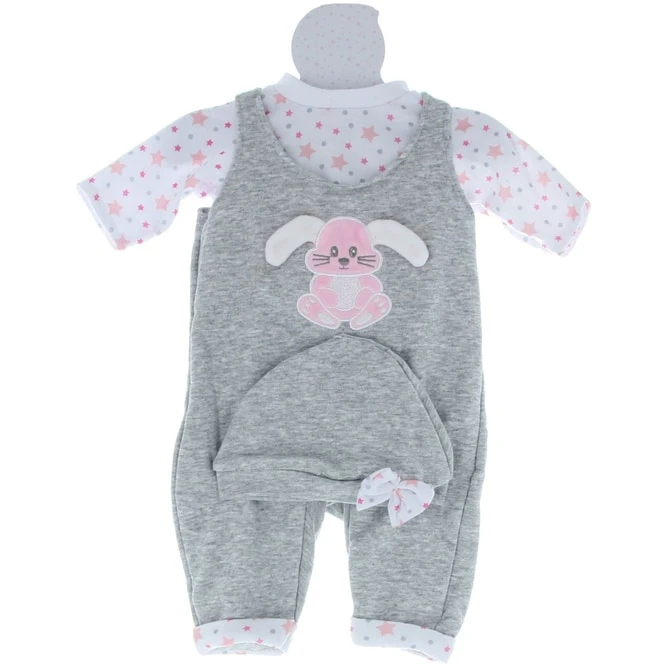 - Strampelanzug in grau mit Hasen-Motiv, Shirt in weiß mit rosa Sternen und grauen Punkten, Mütze
